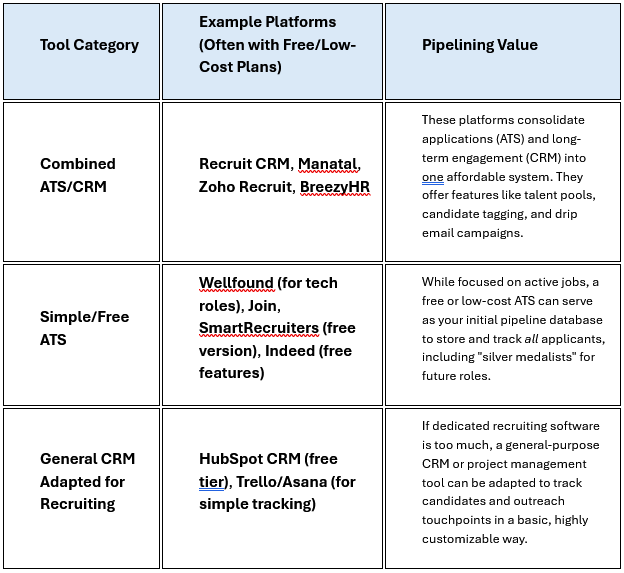Looking for an organized way to pipeline candidates on a budget? There are plenty of choices! Here are a few examples of systems that can provide ATS and/or CRM capabilities at affordable (and sometimes free!) cost: