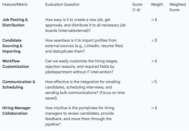 It’s best to be organized and efficient when evaluating ATS vendors.  Evaluations should focus on key areas that directly impact recruiter efficiency, candidate experience, data integrity, and compliance.  Use a tool that rates qualities and weights them according to importance.  Below is an example of a rating system for Recruiter Efficiency:
